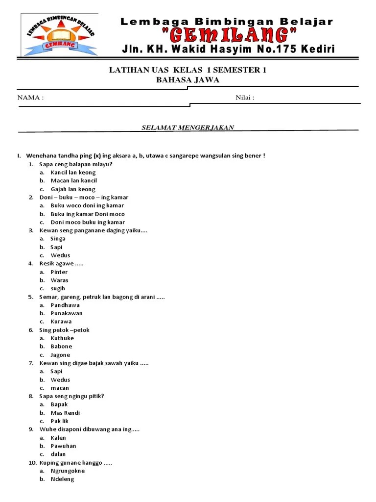 Inilah pembahasan soal dan jawaban latihan uas, ukk dan pat untuk siswa kelas 3 sd / mi materi bahasa jawa semester genap.